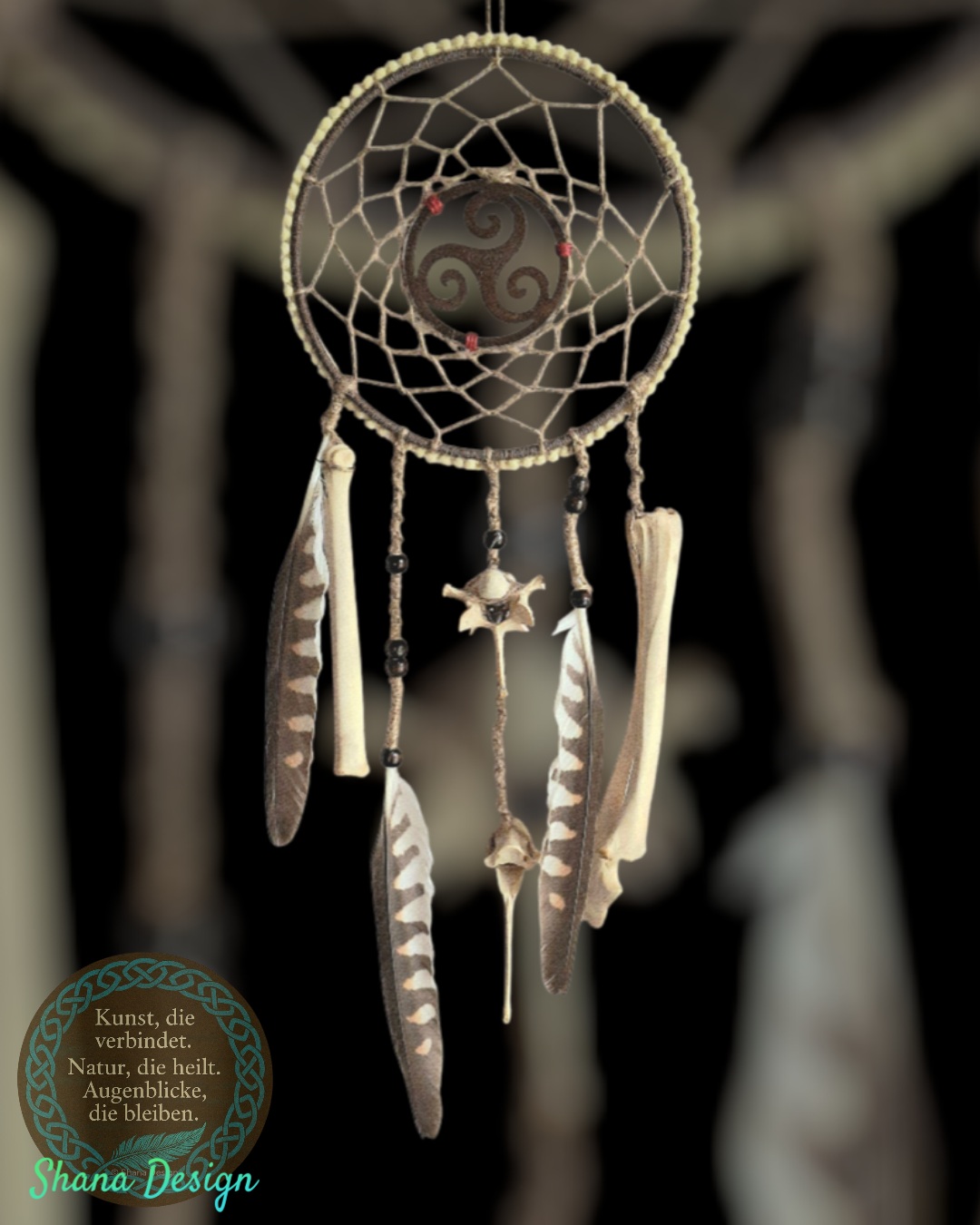 Echte Falkenfeder, Fundknochen, das handgeknüpfte Netz und die Triskele verbinden sich zu einem stillen Wächter zwischen den Welten.