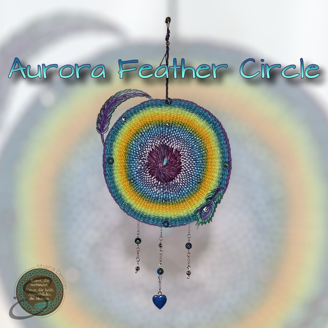 Details: Wolle, Perlen, Metall, Lederband, Feder. Maße: ca. 19 cm Durchmesser, Gesamtlänge ca. 37 cm. Mit höhenverstellbarer Aufhängung.